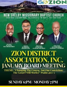 We invite you to join us for the upcoming Zion District Association January Board Meeting hosted by New Shelby Missionary Baptist Church.